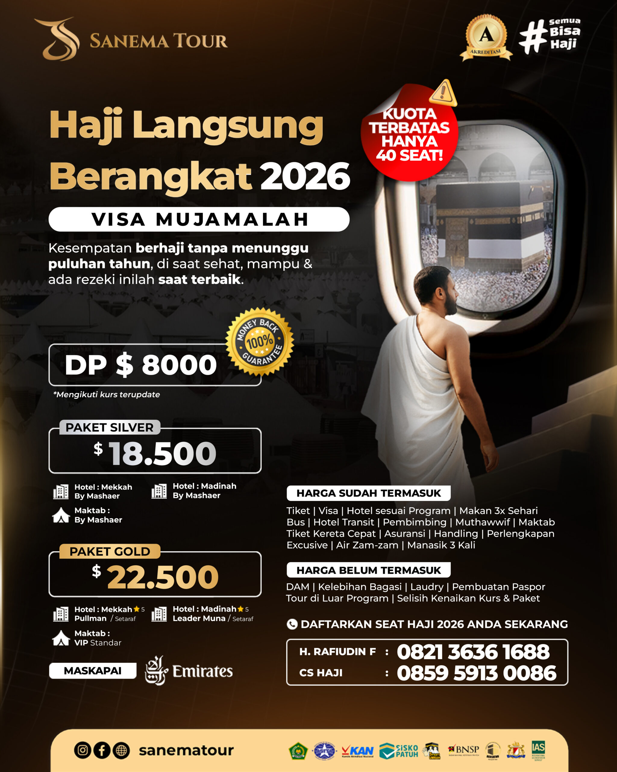 Sanema Tour menghadirkan Haji Khusus/Haji ONH Plus dengan layanan istimewa, fasilitas berbintang, dan pendampingan ibadah yang tertata sejak awal hingga kembali ke tanah air.